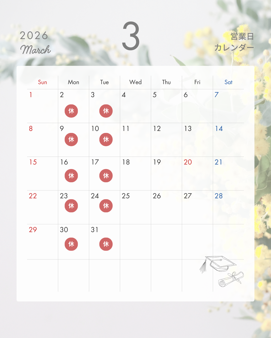 | 月 | 火 | 水 | 木 | 金 | 土 | 日 | 祝 | |